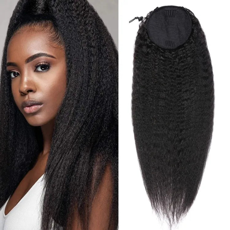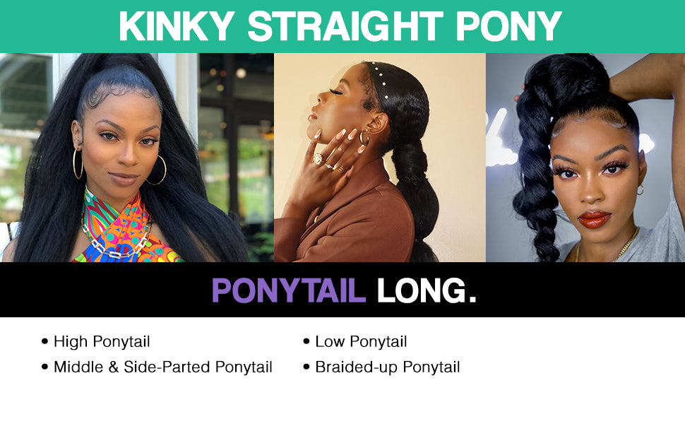 Our kinky straight ponytails are texlaxed / transitioning texture in easy-to-wear ponytails! Ponytails are a fast and easy way to transform your look in under 1 minute. Simply put your own hair into a bun and attach the ponytail using the attached combs and drawstring. Add our innovative bangs for a straight from the salon look! A quick and easy style for an everyday look, weekends, or special occasions.
